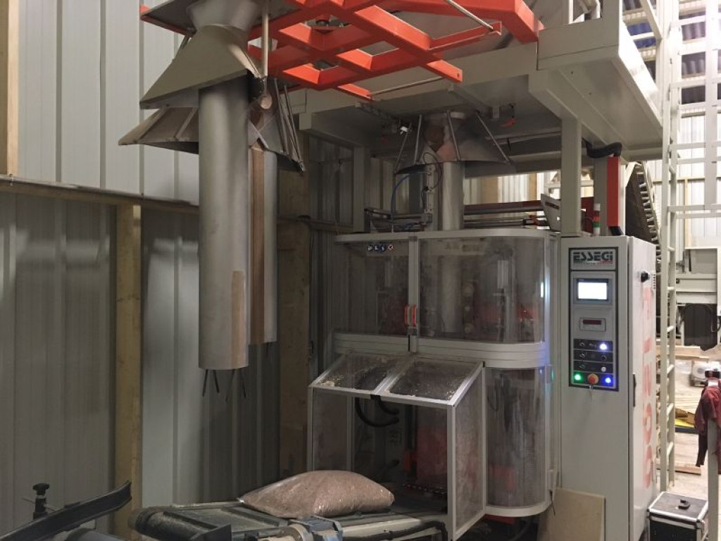 Cette chaîne de production est dotée d'une trémie de 5m3 alimentée par des tapis convoyeurs. L'ensacheuse pèse le produit, conçoit le sac, le remplit et le soude. Elle est dotée de 4 tubes conformateurs pour PE simple (650mm, 850mm, 980mm et 1150mm) qui lui permettent de s'adapter au mieux à votre produit (de 1 à 25 Kg). Elle est aussi dotée d'un tube conformateur 4 soudures de 720mm pour film complexe.